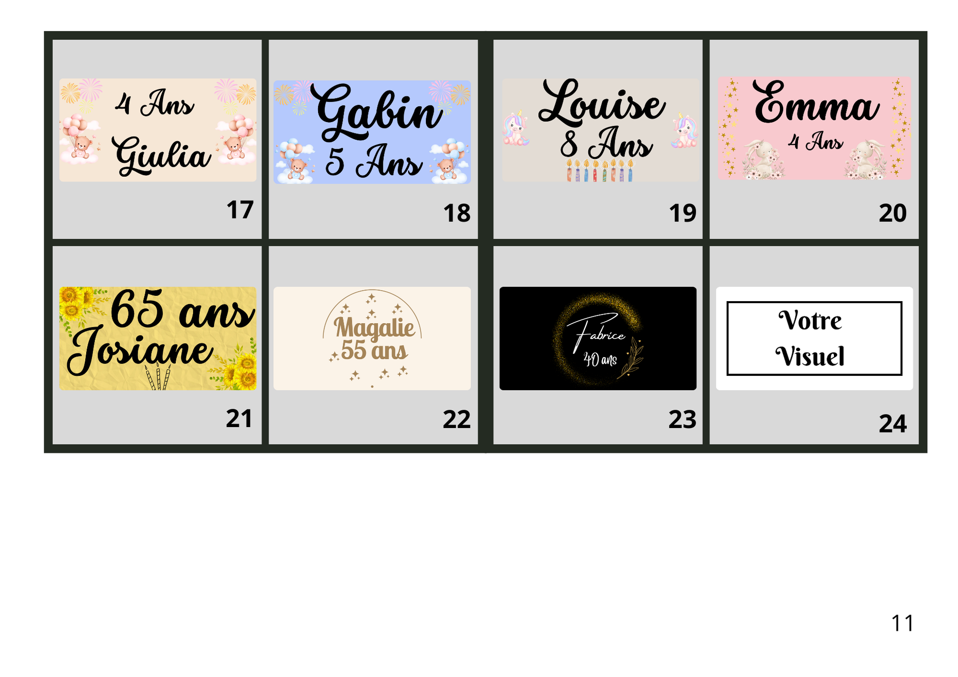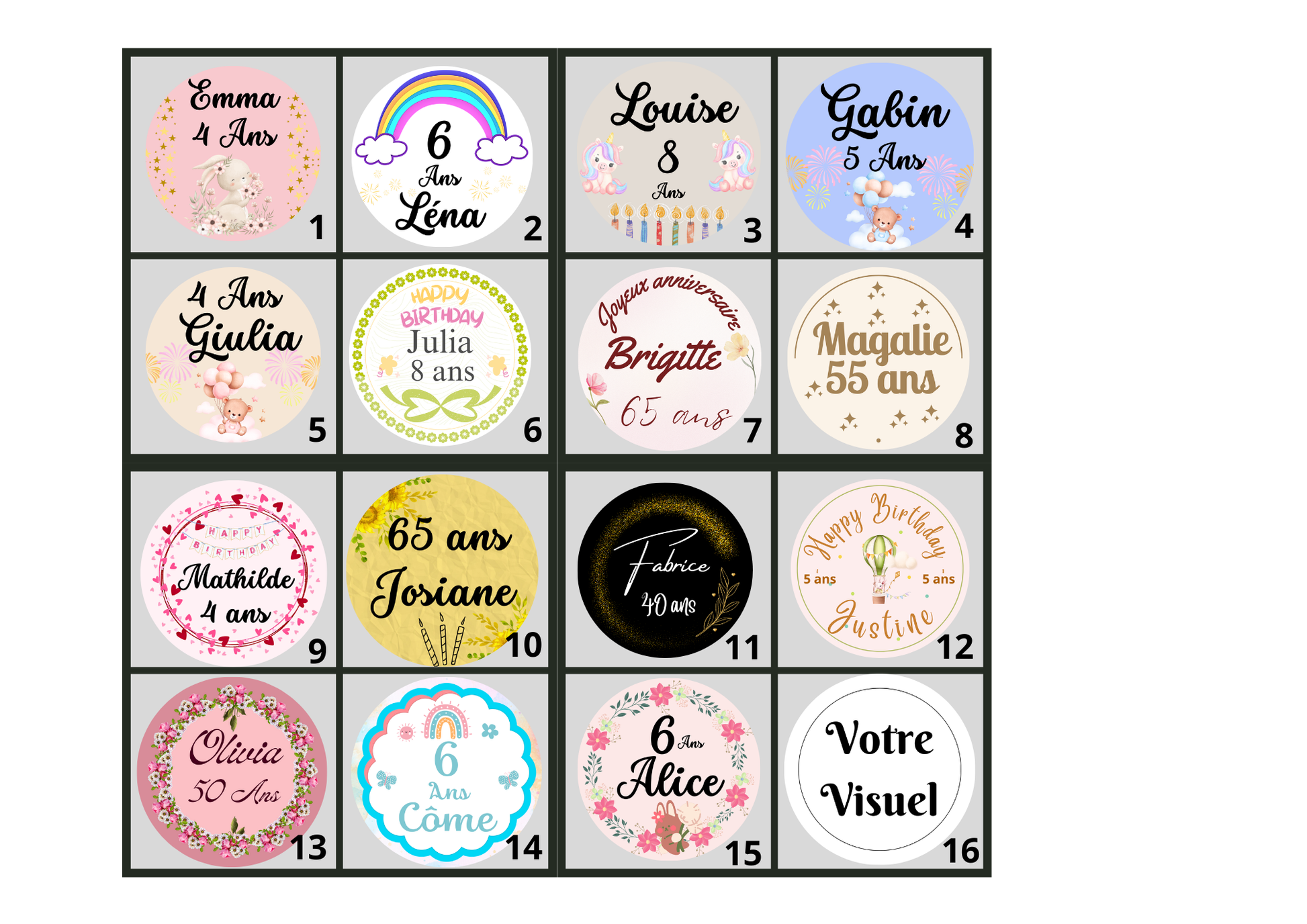 - Personnalisation complète : Choix de votre visuel d'étiquettes, nom et date de votre choix, couleur modifiable.