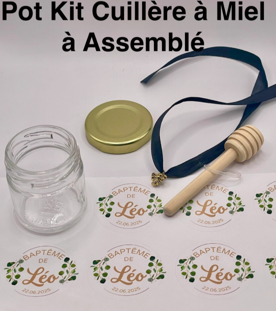 Pot Kit Cuillère à Miel à Assemblée - Pot vide à personnaliser_Kit pour cadeaux Mariage, Baptême, Anniversaire, baby shower... A remplir avec Miel, Dragées, Confiture, Bonbons...